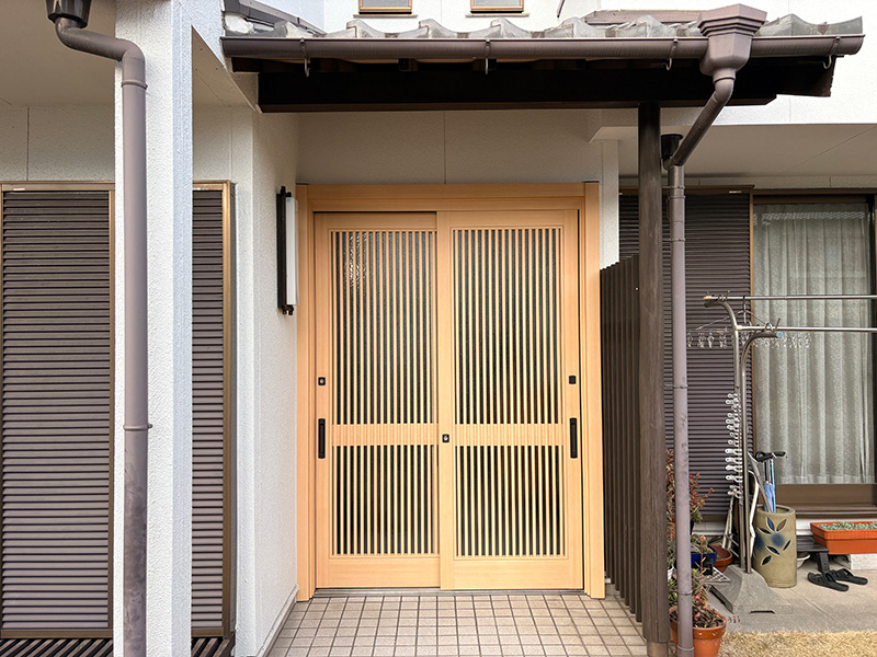 | 商品仕様 | 玄関ドア:LIXIL TOSTEM リシェント玄関引戸2 SG仕様 2枚建 ランマなし 網戸付(デザイン:S51型、色:檜調) | ||