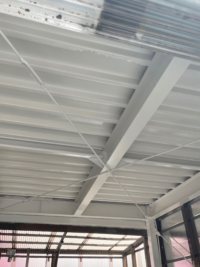 錆止めをし、綺麗に塗装したガレージの屋根