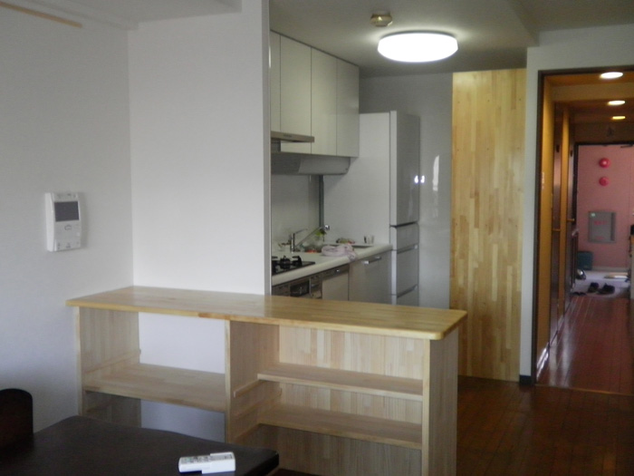 キッチン:クリナップ ラクエラ(W2100) カウンター収納・棚:パイン集成材・クリア塗装 クロス:サンゲツ SP級 |