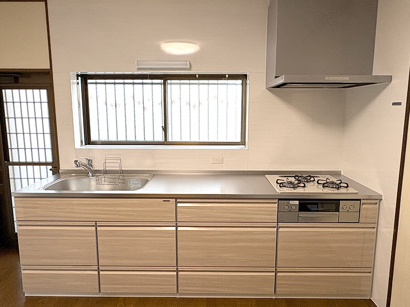 キッチン左側に勝手口のドア枠があり、設置スペースに制約がありましたが、仕様を調整することでぴったりと納めることができました。
