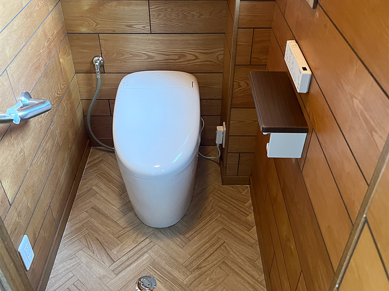 トイレ:TOTO ネオレストRS1 紙巻き器:TOTO 2連式紙巻き器(色:ダルブラウン) 床材(クッションフロア):シンコール ポンリューム(品番:E1047) |